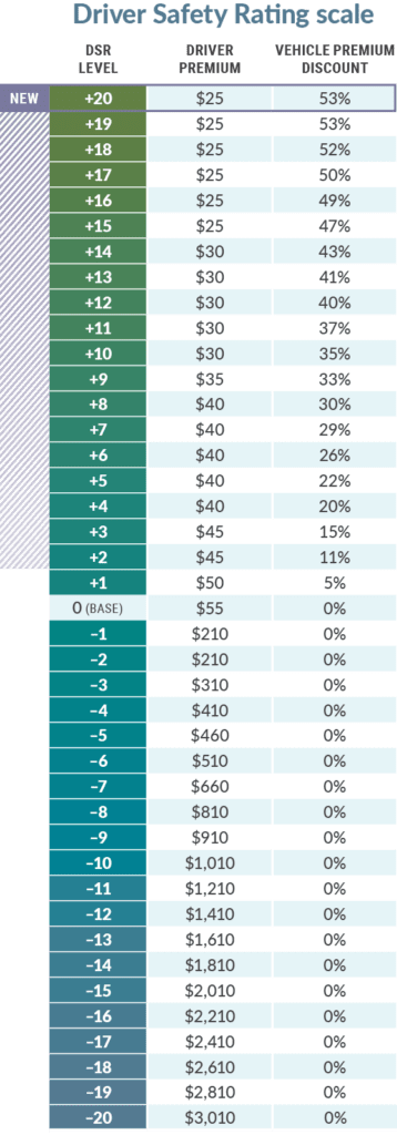 Your position on the DSR scale depends on your driving record. Driving safely moves you up the scale, which saves you money – up to 53 per cent savings on vehicle premiums and up to an additional $30 savings on driver’s licence premiums. High-risk driving, including traffic convictions, at-fault claims, distracted or impaired driving will move you down the scale. The highest-risk drivers pay up to a $3,010 premium on their driver’s licence charge and receive no savings on their vehicle insurance.