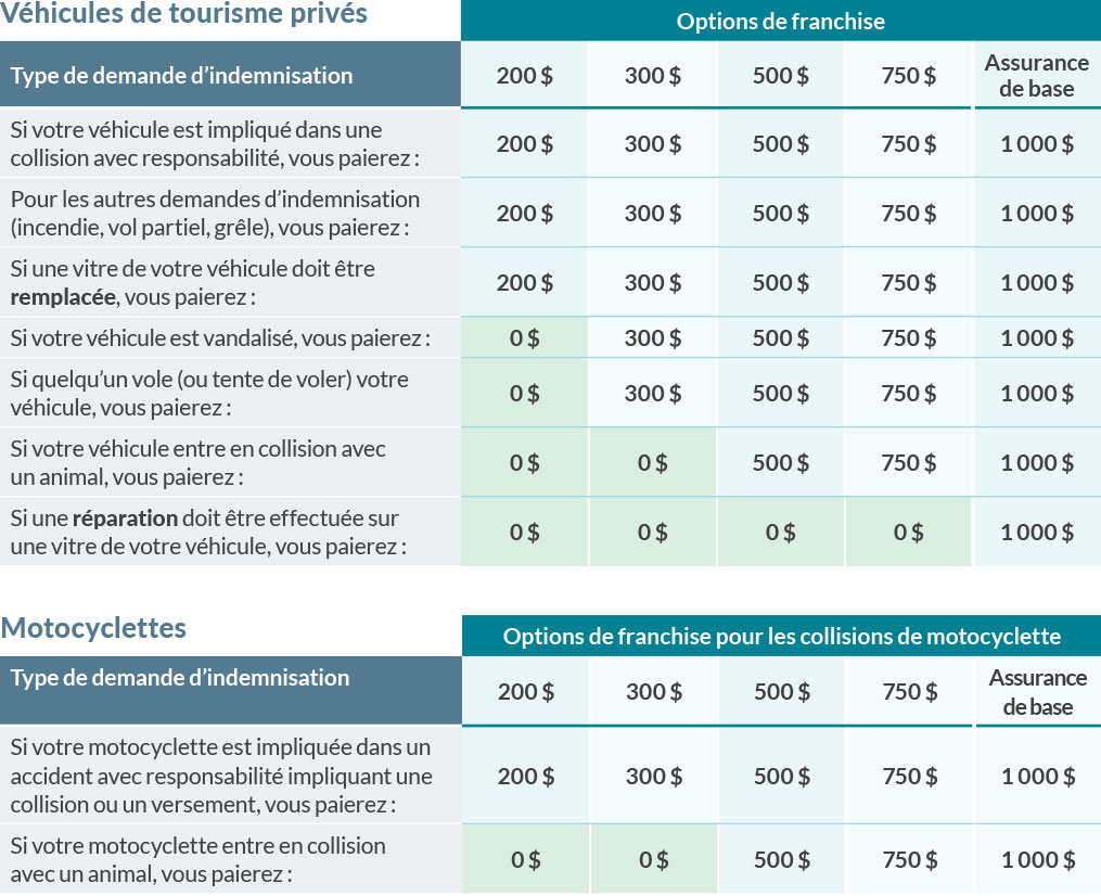 Découvrez vos options. Le tableau comparatif ci-dessous indique le montant de franchise que vous devrez payer par type de demande d’indemnisation selon l’option de franchise sélectionnée.